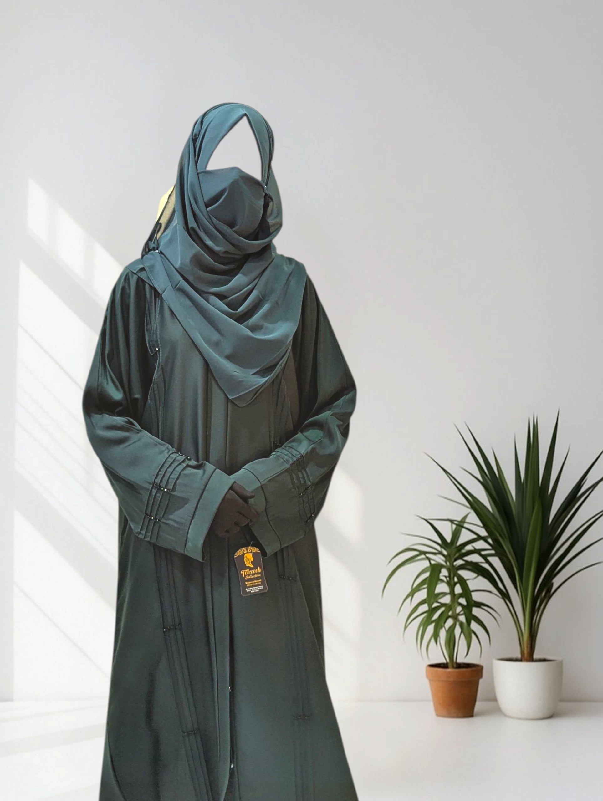 It features a front open design with pearls and sequins work inspired by branches pattern on the bottom of Abaya. The full sleeves ending with elastic puffs makes the entire appearance put together flawlessly.